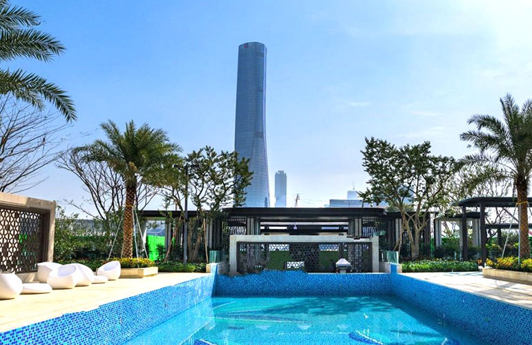 项目由华发联合国际大师团队,以三轴一心的布局,打造东南亚风情园林景观,突出业主归家仪式感与尊贵感的同时,也保证了户户有风景。从空中俯瞰,四风峰景四栋建筑以门楼——泳池——中央绿轴对称分布,小区设计了主入口落客区、景观泳池、休闲广场、休闲廊架、儿童活动场地、成人活动场地、景观水景等休闲活动空间,全区建有风雨连廊系统。贴心的设计团队不愿让住户多走一步,精心计算、设计连廊路径。