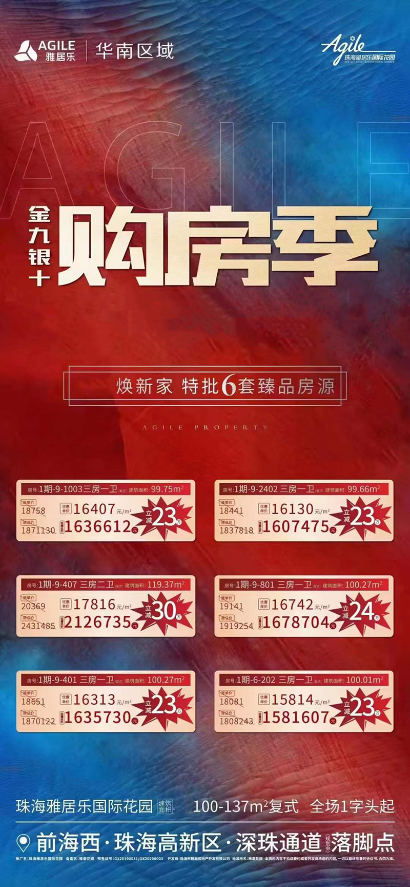 珠海 雅居乐国际花园(户型 动态 相册)项目国庆假期提前享,6套特惠房源,户型建筑面积100.08-100.44㎡,其中1期-6-202房复式,建筑面积100.01㎡三房,原单价18081元/㎡,特惠单价14233元/㎡,原总价180.8万元/套,特惠总价142.3万元/套,其他房源具体优惠详情见下图,一房一价,活动截止时间为2022年10月7日。